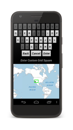 Additionally, with an internet connection or cached data, you may enter a custom 2, 4, or Six hero QTH locator value to present the Field (green square), Grid Square (black square) and SubGrid (dark blue square) space on a map. Tap and keep the Grid Square value field to enable the Custom Grid Square Keyboard arrangement and map.